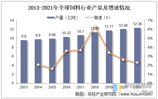 2013-2021年全球飼料行業產量及增速情況